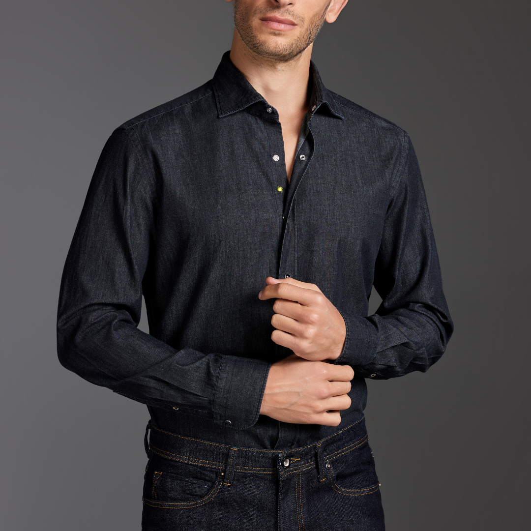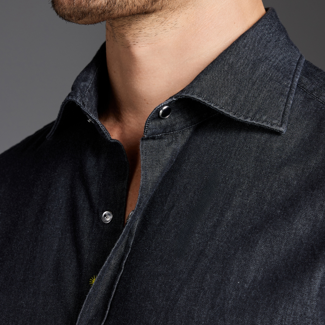 This SLIM-fit shirt is crafted from 100% cotton denim, treated with a stone-wash that softens the fabric and gives the charcoal-black tone a sophisticated, nuanced finish. The result is a denim shirt with presence — rich in color, smooth in hand, and quietly expressive.