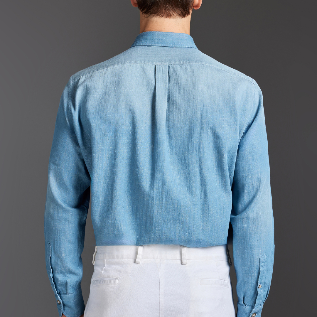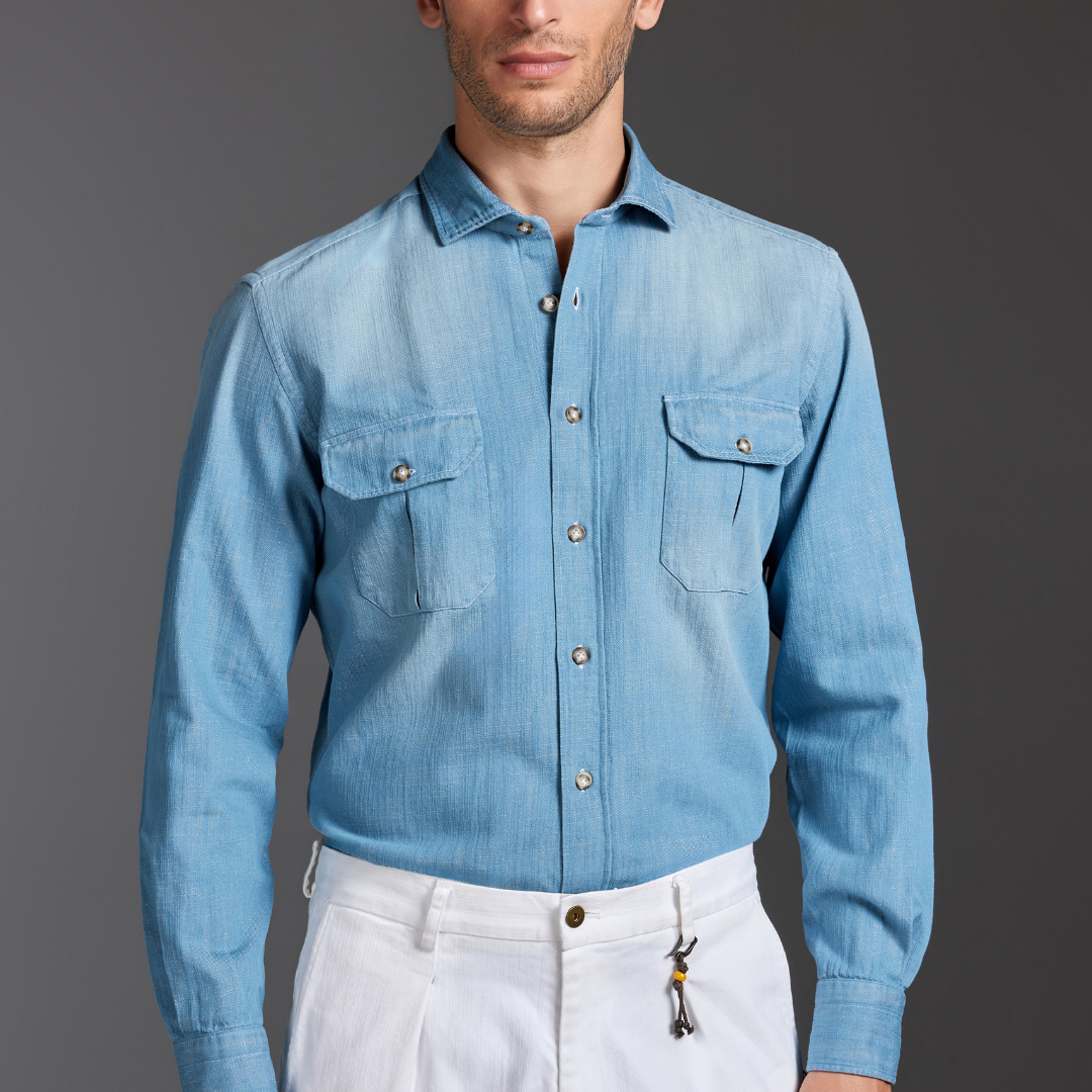 This SLIM-fit shirt is crafted from 100% heavy cotton twill denim, washed and treated with sabbiature to create a luminous celeste tone with soft tonal variations. The twill weave adds body and presence, while the wash enhances comfort and the naturally refined texture.