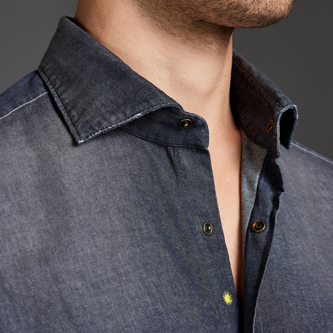 This SLIM-fit shirt is made from 100% cotton denim twill in a deep midnight tone, softened through sabbiature and finished with artisanal abrasions on the collar and cuffs. These subtle details create depth and a naturally aged elegance, while maintaining the clean, refined lines of the silhouette.
