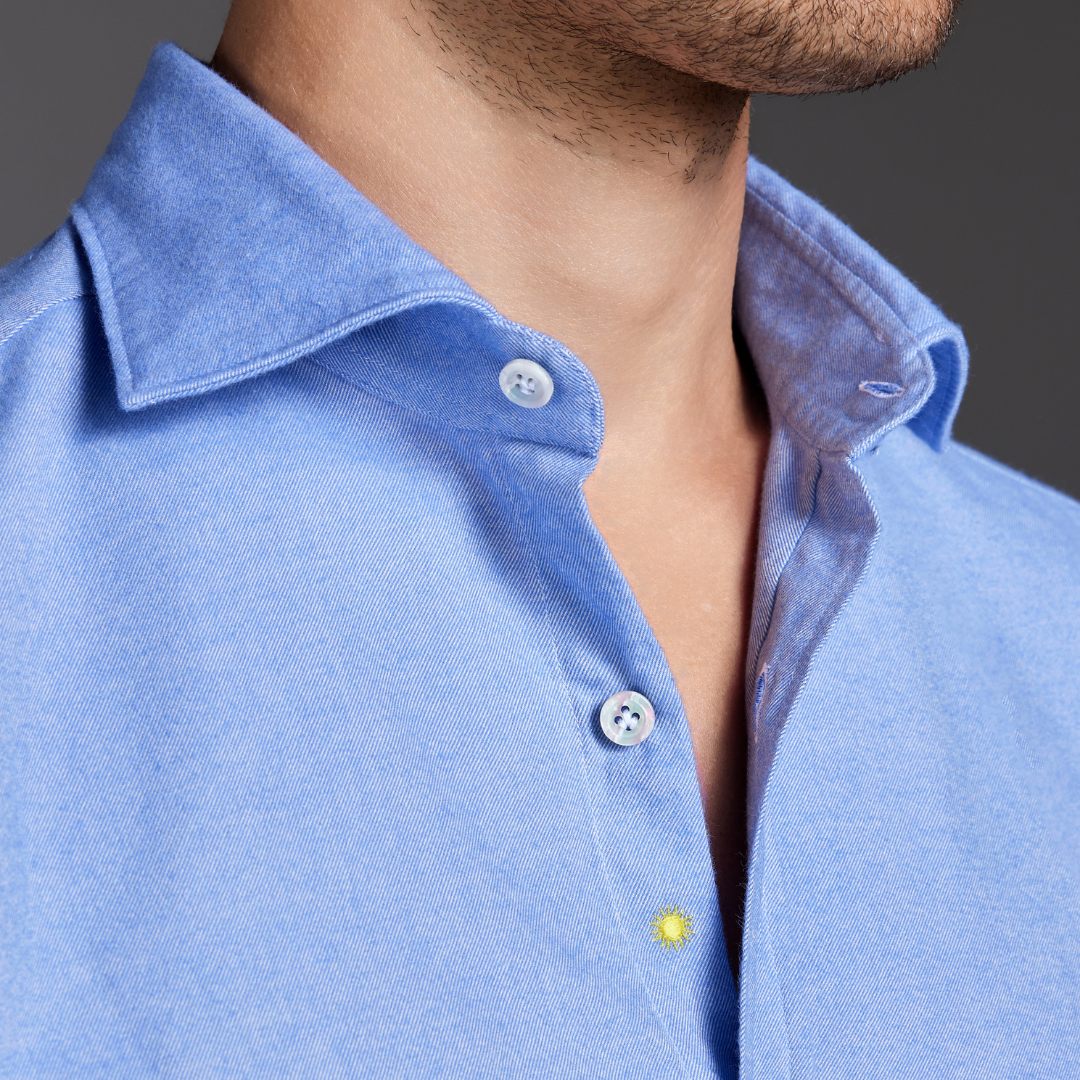 This SLIM-fit shirt is crafted from 100% cotton, washed gently to enhance both comfort and the delicate celeste tone of the fabric. The flannel weave adds a refined texture, creating a piece that feels warm, lightweight, and quietly elegant.