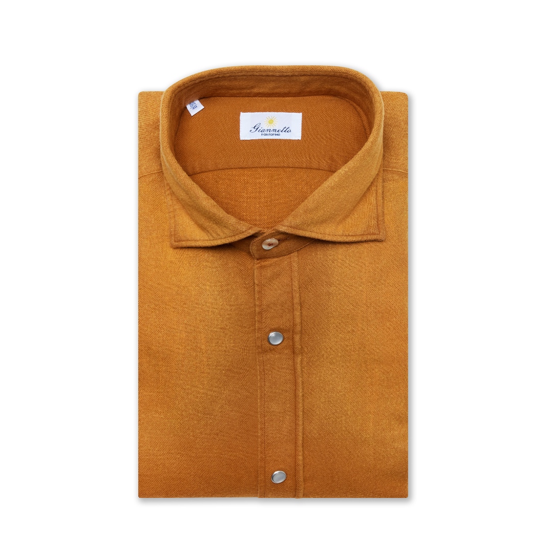 This shirt is crafted from 100% cotton flannel and treated with sabbiature to soften the fabric and create delicate tonal variations across the rust-amber surface. The result is a warm, expressive color with a naturally lived-in elegance, balanced by the smooth structure of the flannel weave.